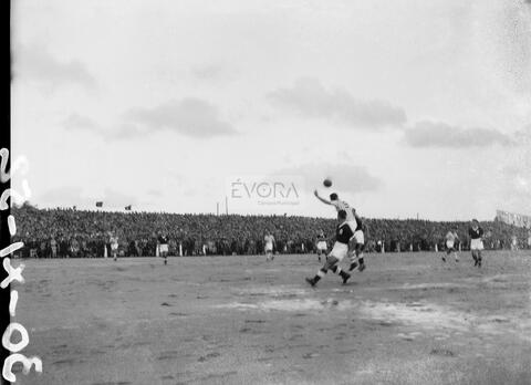 Fase do jogo de futebol entre o Lusitano e o Benfica (Campeonato Nacional 1ª Divisão), no Campo Estrela, e cujo resultado final foi o seguinte: Lusitano 0 - Benfica 3